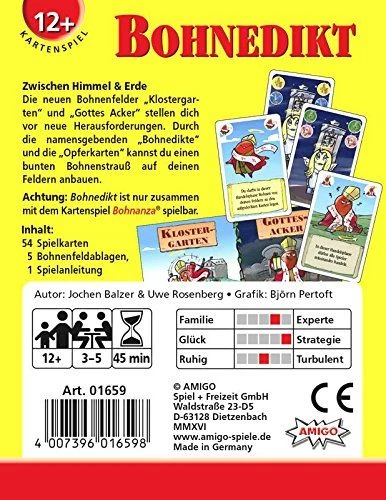 Die neuen Bohnenfelder „Klostergarten“ und „Gottes Acker“ stellen dich vor neue Herausforderungen. Durch die namensgebenden „Bohnedikte“ und die „Opferkarten“ kannst du einen bunten Bohnenstrauß auf deinen Feldern anbauen. Achtung: Das Erweiterungs-Set ist nur zusammen mit dem Kartenspiel Bohnanza spielbar.