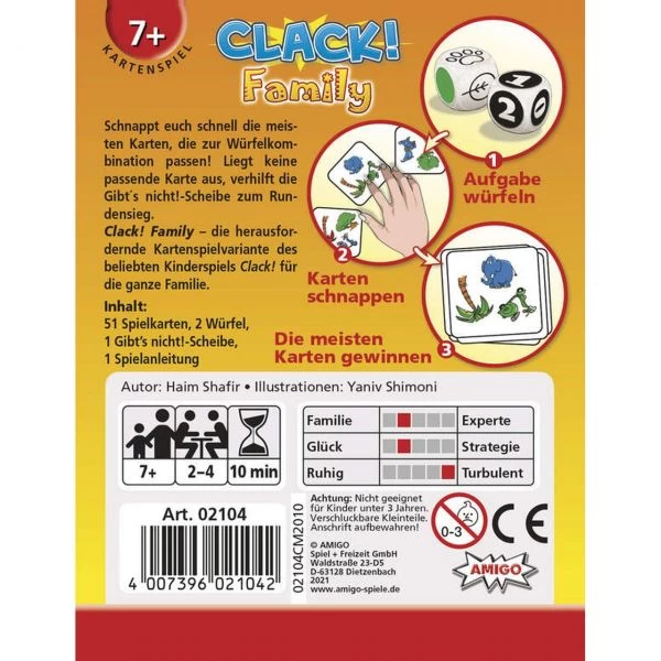 Liegt keine passende Karte aus, verhilft die „Gibt´s nicht!“-Scheibe zum Rundensieg. Clack! Family ist die herausfordernde Kartenspielvariante des beliebten Kinderspiels Clack! für die ganze Familie.