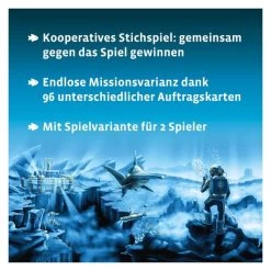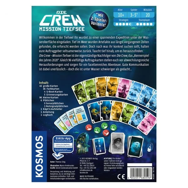 Auf in unglaubliche Unterwasser-Abenteuer! Dieses kooperative Kartenspiel führt die Spieler auf Expedition in die dunklen Tiefen des Meeres. Was wird sie dort erwarten? Nur im Team wird diese Mission ins Unbekannte gelingen. Karte für Karte erfahren die Spieler, welche Herausforderungen auf sie warten. Wenn keine Fehler passieren und jeder seine Aufgabe richtig erfüllt, gelangen sie alle gemeinsam ans Ziel. Kommunikation zwischen den Spielern ist das A und O bei diesem Kartenspiel – doch das ist unter Wasser gar nicht so einfach!