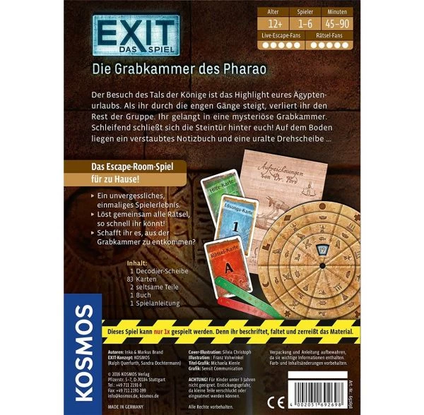 Bei „EXIT – Das Spiel“ entdecken die Spieler mit etwas Kombinationsgabe, Teamgeist und Kreativität nach und nach immer mehr Gegenstände, knacken Codes, lösen Rätsel und kommen der Freiheit Stück für Stück näher. Dabei müssen auch ungewöhnliche Wege beschritten werden. So darf das Material geknickt, beschriftet oder zerrissen werden.