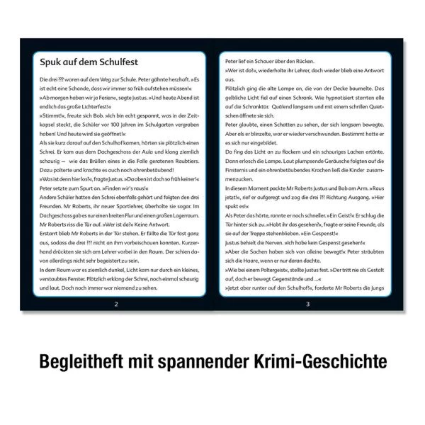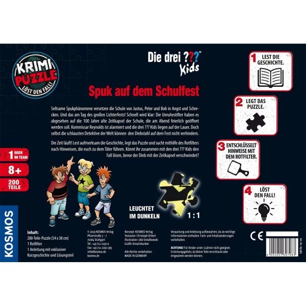 Kriminalfall Lesen, Leuchtpuzzle legen, Fall lösen Für alle Rätsel- und Puzzle-Fans! Diesmal haben es die drei ??? Kids mit einem höchst mysteriösen Fall zu tun und brauchen die Hilfe der Spieler. Nachdem diese die spannende Geschichte gelesen haben legen sie das Puzzle – Stück für Stück entsteht so vor ihren Augen der Tatort, an dem es nur so von Hinweisen wimmelt. Geniales Extra: das Puzzle leuchtet im Dunkeln und manche Indizien sind nur mit beiliegendem Rotfilter zu entschlüsseln!