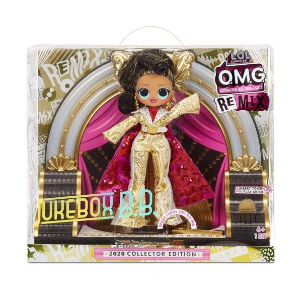 Bist du bereit fĂĽr Rock ’n‘ Roll? Wir stellen vor: Jukebox B.B., die einzigartige L.O.L.-Surprise! O.M.G. Remix 2020 Collector Edition Modepuppe. Diese Königin tropft von Kopf bis FuĂź in Gold – von ihren funkelnden, goldenen Strähnchen in ihrem Haar ĂĽber die aufwendigen goldfarbenen Nähte auf ihrer Mode bis hin zu ihren luxuriösen Accessoires.