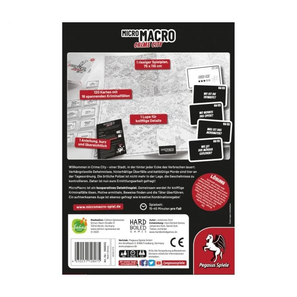 Willkommen in Crime City, einer Stadt, in der hinter jeder Ecke das Verbrechen lauert. Verhängnisvolle Geheimnisse, hinterhältige Überfälle und kaltblütige Morde sind hier an der Tagesordnung. Die örtliche Polizei ist nicht mehr in der Lage, die Geschehnisse zu kontrollieren. Daher ist die Arbeit pfiffiger Ermittler gefragt. MicroMacro – Crime City ist ein kooperatives Detektivspiel. Gemeinsam lösen die Spieler 16 knifflige Kriminalfälle, indem sie Motive ermitteln, Beweise finden und die Täter überführen. Ein aufmerksames Auge ist ebenso gefragt wie kreative Kombinationsgabe, um auf dem 75 x 110 cm großen Spielplan alles zu enträtseln. Als kleine Hilfe ist dazu im Spiel eine Lupe enthalten.