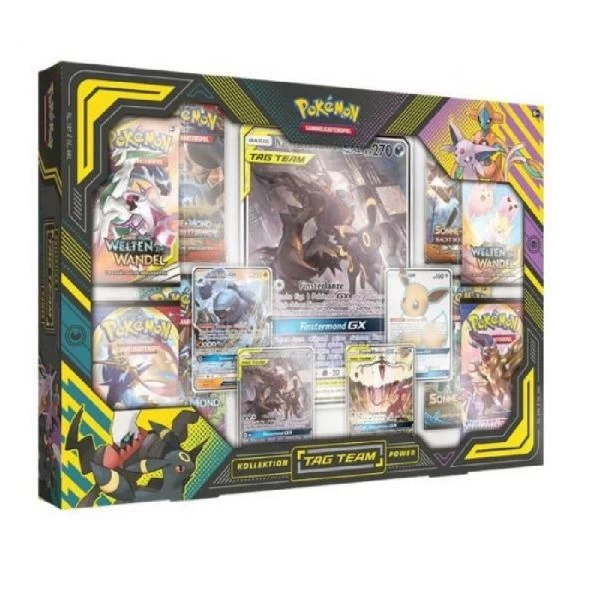 Fühlst du dich stark genug? Dann bist du bereit für die neue Kollektion TAG TEAM Power. Eine riesige Auswahl an TAG TEAM Pokémon, Pokémon-GX und vieles mehr erwarten dich. Diese neue Kollektion beschert dir zwei TAG TEAM Pokémon-GX als besonders geprägte Karten mit besonderen Illustrationen, eine atemberaubende überdimensionale Version einer dieser Karten und fünf zusätzliche Pokémon-Promokarten, um dich rundum auf den Kampf vorzubereiten. Du erhältst acht Boosterpacks des Pokémon-Sammelkartenspiels, um deinen Reihen noch mehr Karten hinzuzufügen zu können. Mache dir diese Kraft zu eigen!