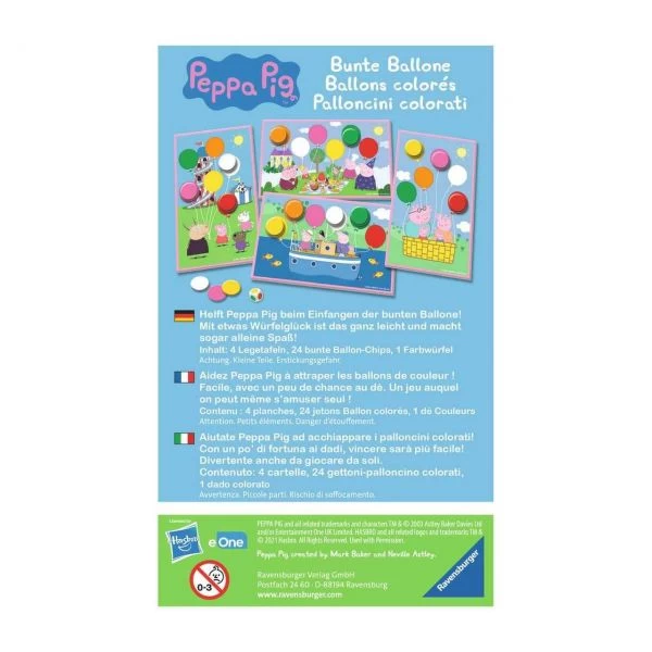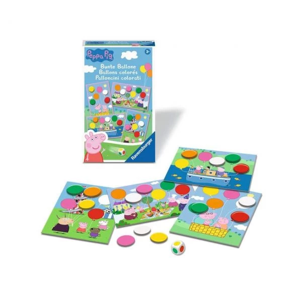 Das Spiel enthält 4 liebevoll gestaltete Legetafeln, einen Farbwürfel und abwischbare Kunststoff-Chips in 6 verschiedenen Farben. 2 – 4 Peppa-Fans ab 3 Jahren können mitspielen, aber auch alleine macht das Einfangen der Bunten Ballone großen Spaß.