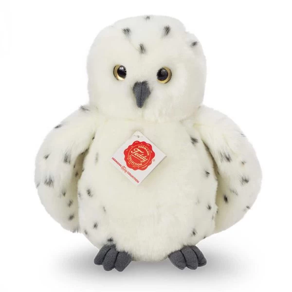 Die Augen und die Flügel verraten, dass der Waldbewohner alles unter Kontrolle hat und sich jederzeit losmacht, um das Geschehen aus einer anderen Perspektive zu beobachten. Das Kuscheltier hat einen kleinen grauen Schnabel und zwei sehr natürlich aussehende graue Pfoten.