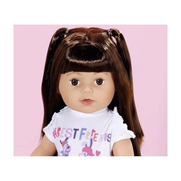 BABY born Sister brunette 43cm mit Jumpsuit, Leggings und Schuhen. Inkl. Flasche, Haarbürste, 2 Spiralgummis, 2 Haarclips, 2 Clips mit Haarsträhnen und je 1 Freundschaftsbändchen für Kind und Puppe