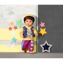BABY borns Streetwear besteht aus einem gelben Hoody und einer lässigen Jogginghose. Das Kapuzenoberteil ist ein 2-in-1 mit angenähter Weste in Jeansoptik. Die brombeer-farbige Hose, sowie die Front des Shirts, sind mit tierisch coolen Prints versehen.