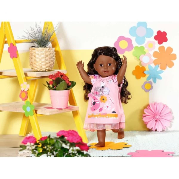 Der Schnitt von BABY borns Sommerkleid sieht auf den ersten Blick ganz schlicht und dezent aus. Schaut man genauer hin, entdeckt man an dem rosa Dress ganz viele Details. Die Ärmel sind kein Ärmel, sondern eine aufwendige Blumenborde. Am unteren Saum schaut eine Lage Tüll heraus, so als ob BABY born einen Unterrock trägt. Und die fliederfarbene Blüte im Brustbereich ist eine Applikation. Da kann der aufgedruckte Hundefreund Bello nur laut „Wau!“ sagen.