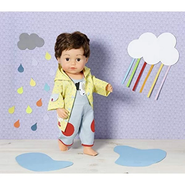 So ein Hundewetter! Aber nicht mit Dolly Moda… Zur süßen Latzhose mit farblich abgesetzten Bündchen und Knie-Patches gibt es eine gelbe Regenjacke mit Kapuze. Wie viele Regentropfen fallen vom Himmel? Mehr als auf dem Ostfriesennerz abgebildet sind? Der putzige Hund auf Hose und Jacke hilft bestimmt beim Zählen. Auf Dolly Moda kann man nämlich immer zählen, denn dank des lässigen Schnitts können Baby born, Baby Annabell und andere Puppen in einer Größe von 39-46 cm fröhlich die Kleidung hin und her tauschen.